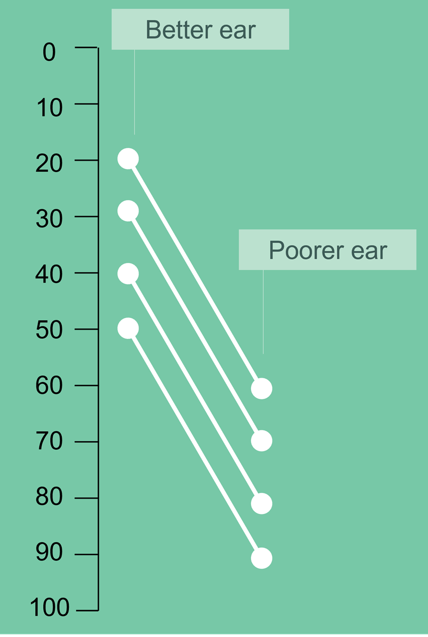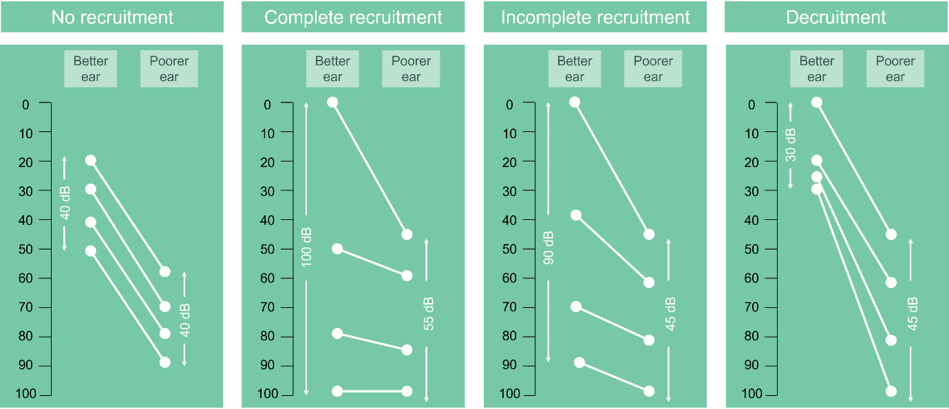 | Incomplete recruitment | Shown by incomplete flattening of the laddergram, indicating a reduced dynamic range in the poorer ear but not to the point of identical loudness perception of the same intensity levels in each ear. |