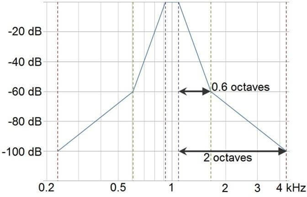 The steeper slopes of the PED noise stimulus offer much improved frequency specificity compared with narrowband noise, reducing the likelihood of erroneous responses generating from off-frequency listening.