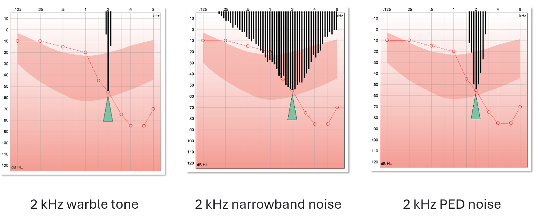 The below images offer a comparison of a 2 kHz warble tone, narrowband noise, and PED noise, overlaid on an audiogram showing a steeply sloping loss.