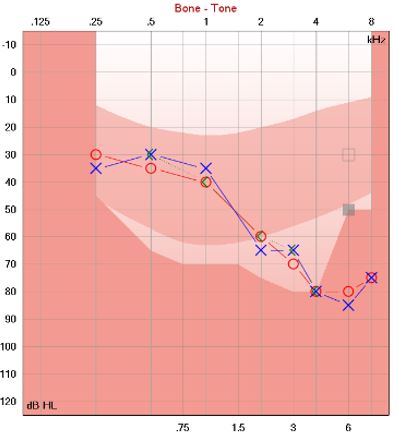 Wenn ein Hörverlust durch Luftleitungstests festgestellt wird, ist eine Prüfung der Knochenleitung zu empfehlen, um die Art der Hörminderung (Schallempfindungs- Schallleitungs- oder kombinierter Hörverlust) zu bestimmen. Der Knochenleitungshörer wird zu Beginn über dem Warzenfortsatz (Mastoid) des schlechteren Ohres platziert. Dabei wird der Hörer so nah wie möglich an die Ohrmuschel gebracht, ohne diese zu berühren oder auf den Haaren aufzuliegen. Es empfiehlt sich, dass der Hörer mit dem montierten Bügel fixiert wird.