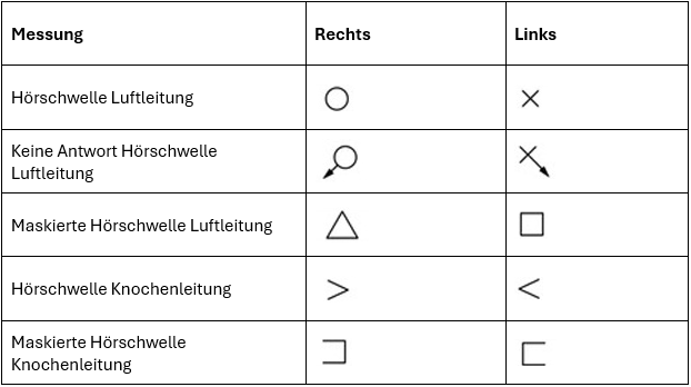 Unten sind die Symbole für die Luft- und Knochenleitungsaudiometrie gemäß der Norm ISO 8253-1:2010 dargestellt (Abbildung 2). Diese werden weltweit am häufigsten verwendet. Jedoch ist zu beachten, dass in einigen Ländern abweichende Symbole benutzt werden. Dies ist für eine korrekte Interpretation der Ergebnisse zu berücksichtigen.