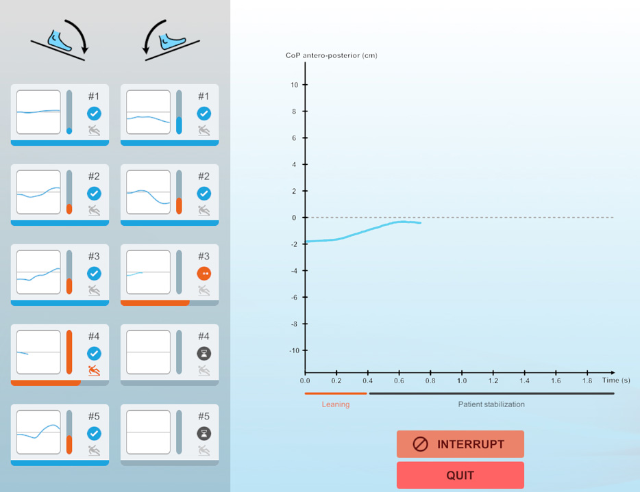 Typically, the assessment begins with a toes-up force plate rotational movement. These movements are completed at standard time intervals to measure the patient’s ability to adapt / use a learning effect.