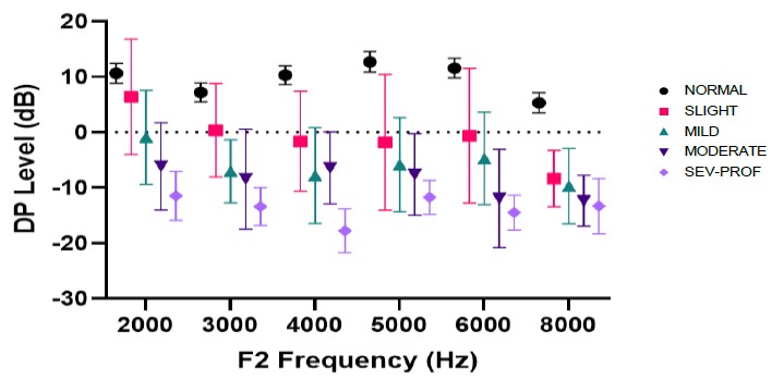 Study 3 was a multisite clinical study funded by the Oticon Hearing Foundation. It included infants and children up to age 7 years using the Interacoustics Titan DPOAE system (Sininger et al., 2018). In this study, 85 children (age 0.7 to 80 months; mean=12.6 mo.) were evaluated using CE-Chirp narrowband ABR thresholds and wideband tympanometry. Groups were defined as normal hearing (n=92 ears) or hearing loss (n=71 ears) based on ABR thresholds exceeding 15 dB eHL at any test frequency between 500 and 4000 Hz and were further categorized from slight to severe-profound hearing loss. DPOAE level and SNR from 2-8 kHz were evaluated using the Interacoustics Titan, with primary tone stimulus levels set at 65 dB SPL (L1) and 55 dB SPL (L2) and primary tone f2/f1 frequency ratio of 1.22. This study showed that slight or greater hearing loss could be detected accurately, and there was a systematic decrease in DPOAE levels with degree of hearing loss (Figure 1).