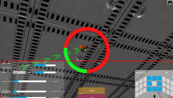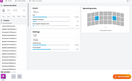 • Viewfinder: there are two options to “catch” the insect in the viewfinder. The head option requires the patient to move their head, and the HTC Vive controller option requires the use of upper limb movements.