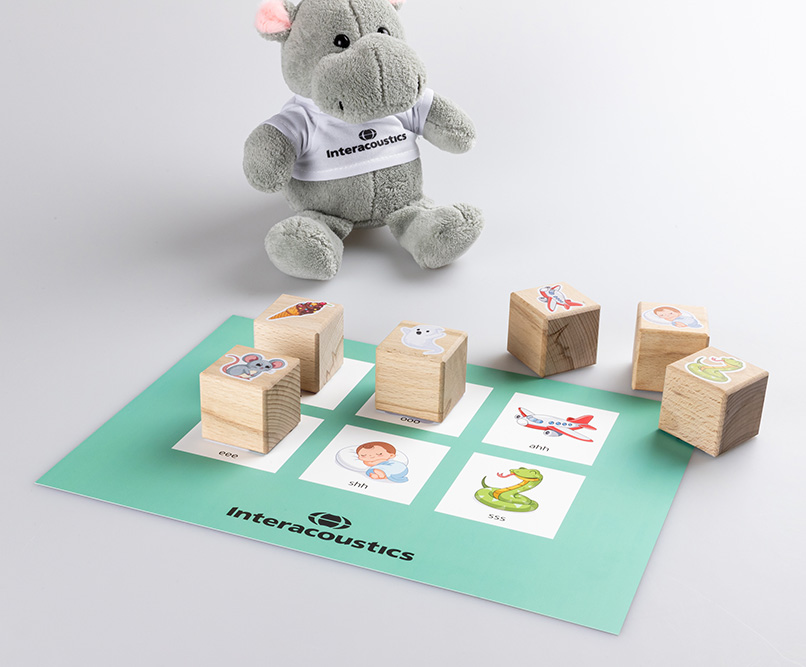 To make the session more fun and interactive, the pediatric module also offers an accompanying mat and Ling-6 blocks, allowing the child to match the sound to the corresponding block (Figure 2).