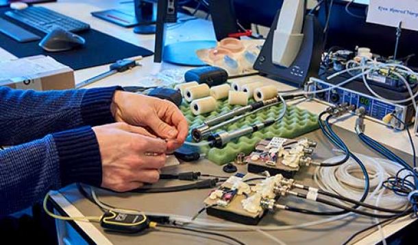 Kren Noergaard at his desk with transducers, simulated ear cavities and more