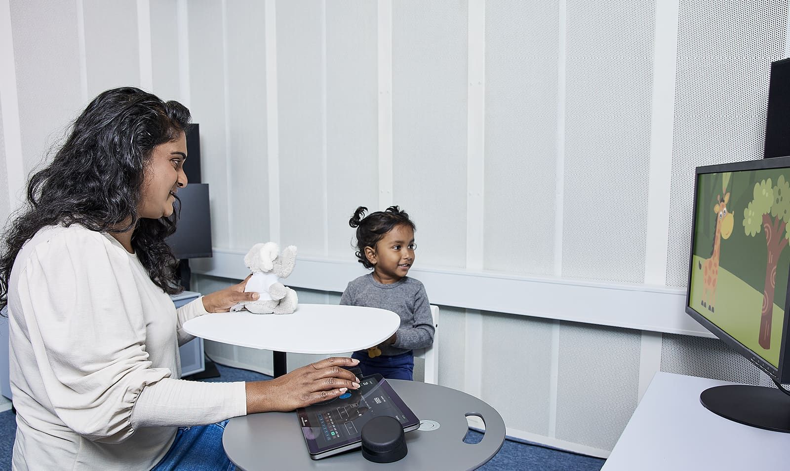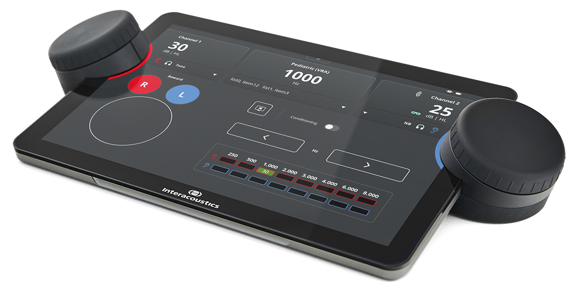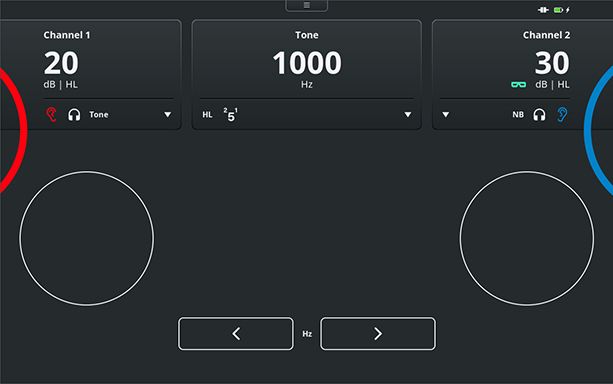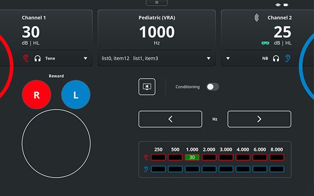 The dedicated screen for pediatric assessments provides you with full control over the output levels of the channels, frequency changes, and the visual rewards.